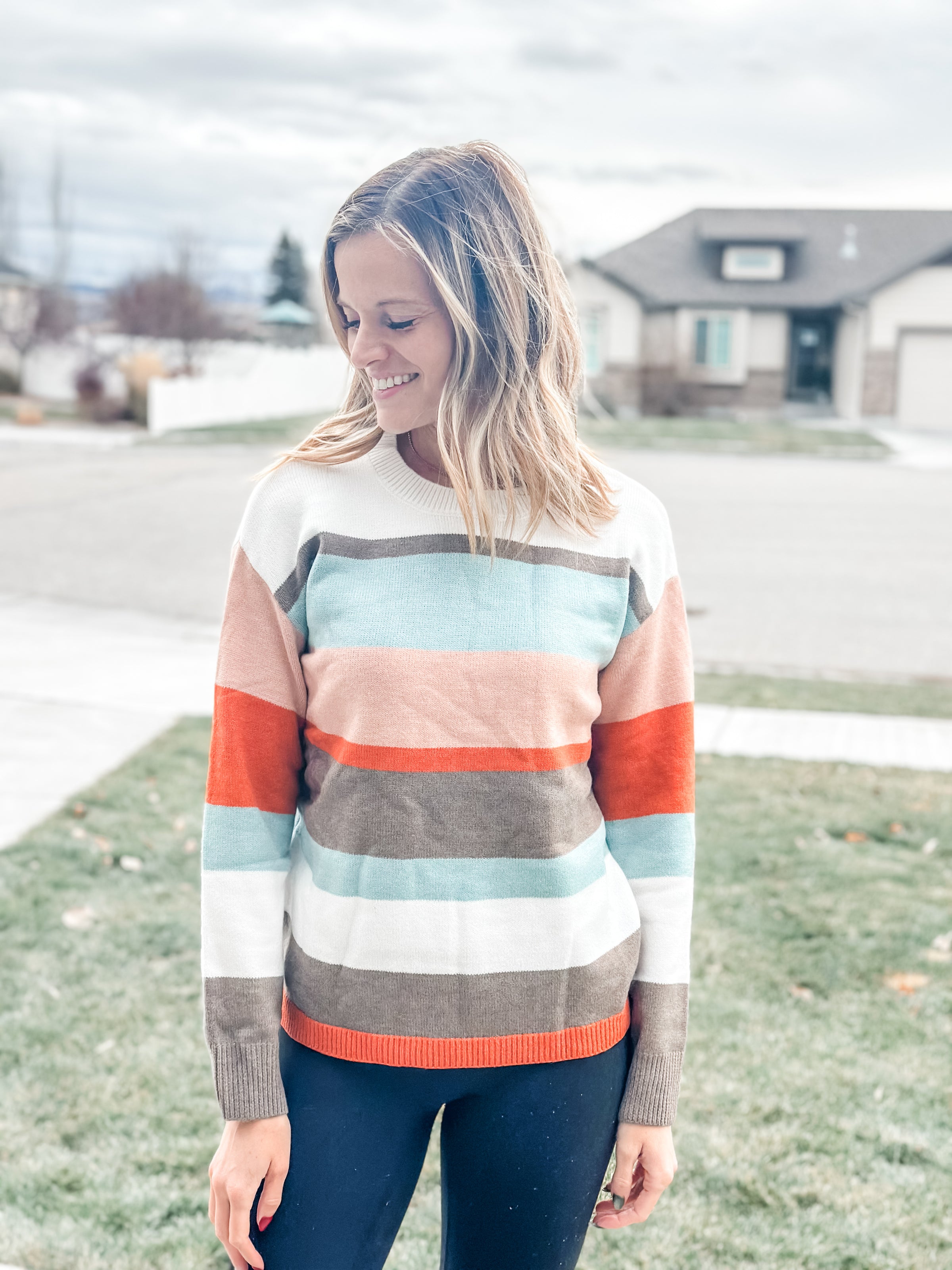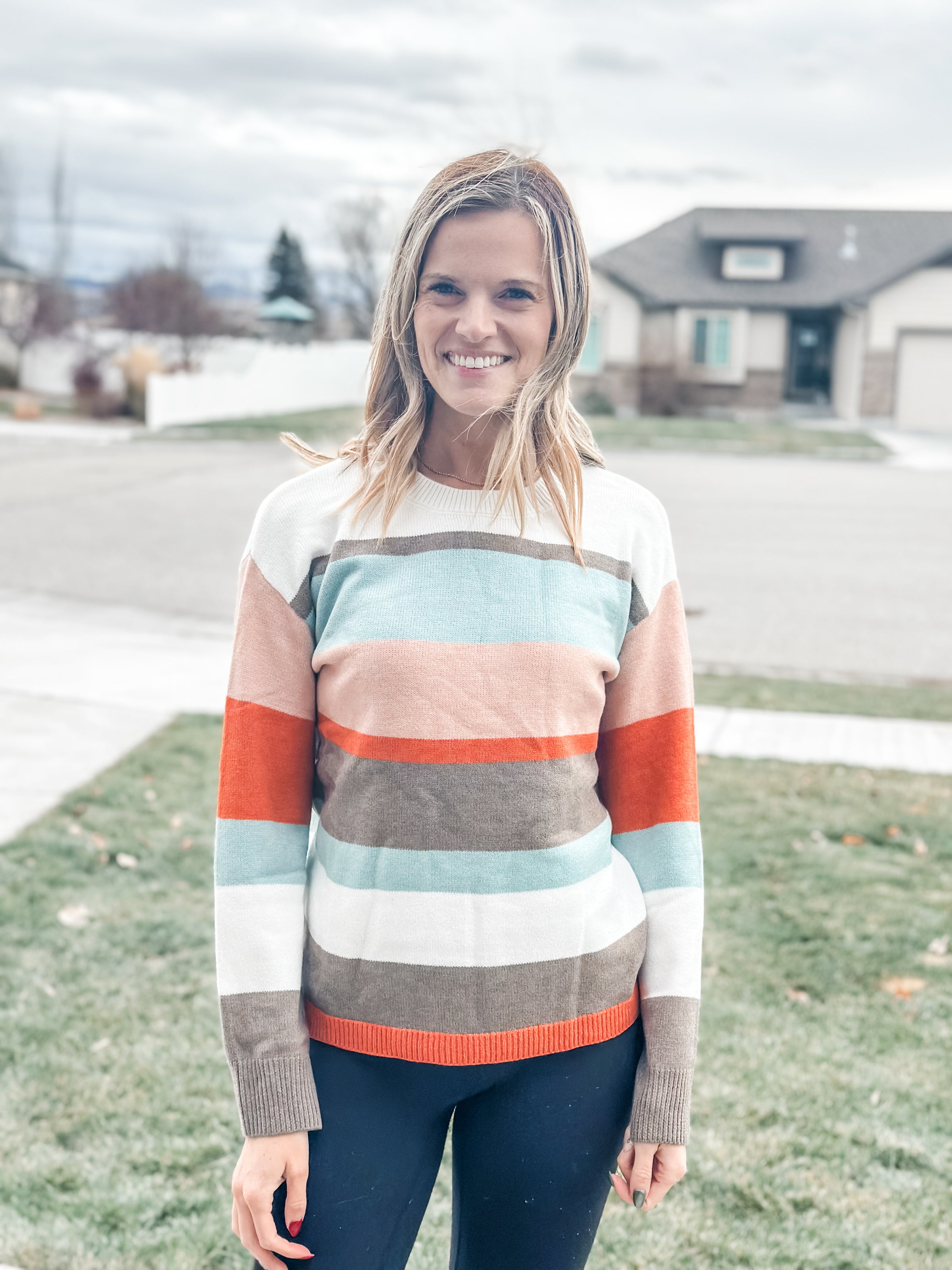 Meet Rashida, your new go-to sweater for effortless cool-weather style. This playful striped color block design features a trendy drop shoulder fit that feels as good as it looks. Wrapped in soft, cozy knit fabric, it's perfect for those days when you want warmth without sacrificing comfort. The relaxed silhouette pairs beautifully with everything from your favorite jeans to flowing skirts, making it a versatile wardrobe essential. Bold, modern stripes bring just the right amount of fun to any outfit.